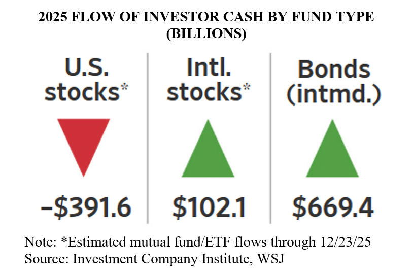 Given outsized performance, it is a bit surprising that investors withdrew nearly $400 billion (net) from U.S. stock mutual funds during the year. Buyers of individual securities, particularly shares of AI-related technology companies, picked up the slack, which helped power the U.S. market higher.