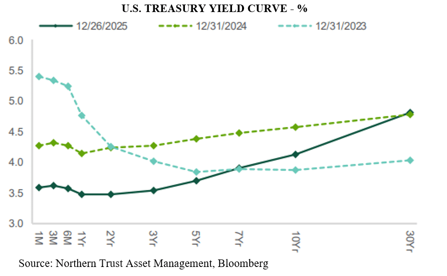Interest rates declined along much of the U.S. Treasury yield curve during the year, including in most segments less impacted by “normal” Federal Open Market activity. Factors influencing investor demand for safe investments include weakening labor markets and global economic uncertainty. The benchmark 10-year Treasury, which began the year yielding nearly 4.60%, ended 2025 paying under 4.20%. Rate cuts by the Fed at its final three meetings of the year helped steepen the slope of the yield curve. For the year, the total return of the Bloomberg Aggregate bond index was 7.3%.