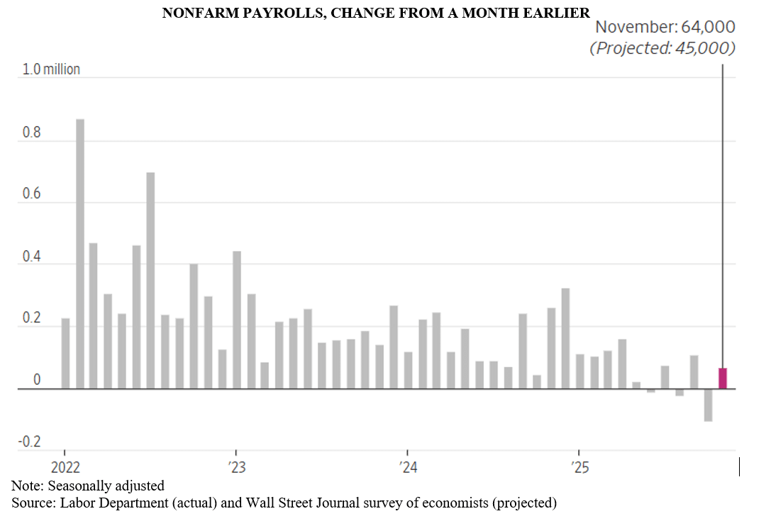November jobs gains totaled 64,000, ahead of the 45,000 projected. However, the unemployment rate rose to 4.6%, its highest level in more than four years. The report also estimated that net job losses the prior month totaled 105,000 (the October employment report was canceled due to the shutdown). Without significant revisions, net job losses occurred in three of the last six months (June, August, October).